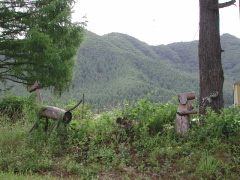 エントランスでは木で作ったウマとワンコがお出迎え |