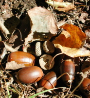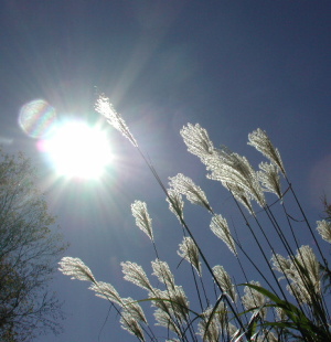 陽射しに透けるススキの穂 足元にはドングリの実。