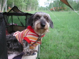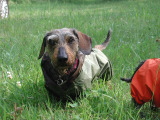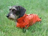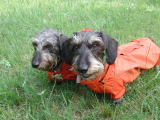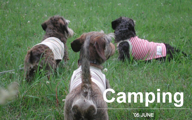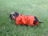 夜露でびっしょりと濡れている草原のお散歩にはこのレインコートが大活躍。